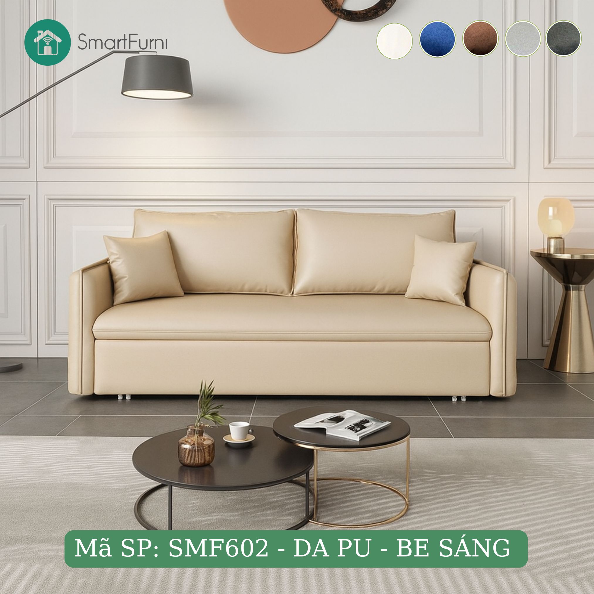 Giường Sofa thông minh SmartFurni SMF602 - Da PU cao cấp - Nhiều Size, Be sáng